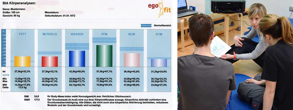 So ist eine objektive Beurteilung der Körperkonstitution möglich, die durch eine übersichtliche, farbige Darstellung der Ergebnisse untermauert wird. – Eine kurze Beratung rundet die Messung ab.