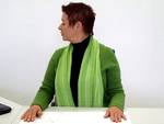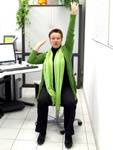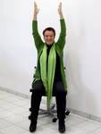 Den Oberkörper nun so weit es geht nach links drehen. Der Kopf, mit Blick so weit wie möglich nach rechts, bleibt aufrecht. Zur Unterstützung der Bewegung ergreift Ihr rechter Arm die Außenkante der Sitzfläche.