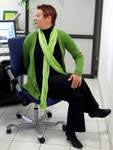 Setzen Sie sich aufrecht auf die Sesselmitte. Schlagen Sie Ihr rechtes über das linke Bein. Drehen Sie den Oberkörper nach rechts und drücken Sie mit der linken Handfläche gegen die Außenseite des rechten Knies.